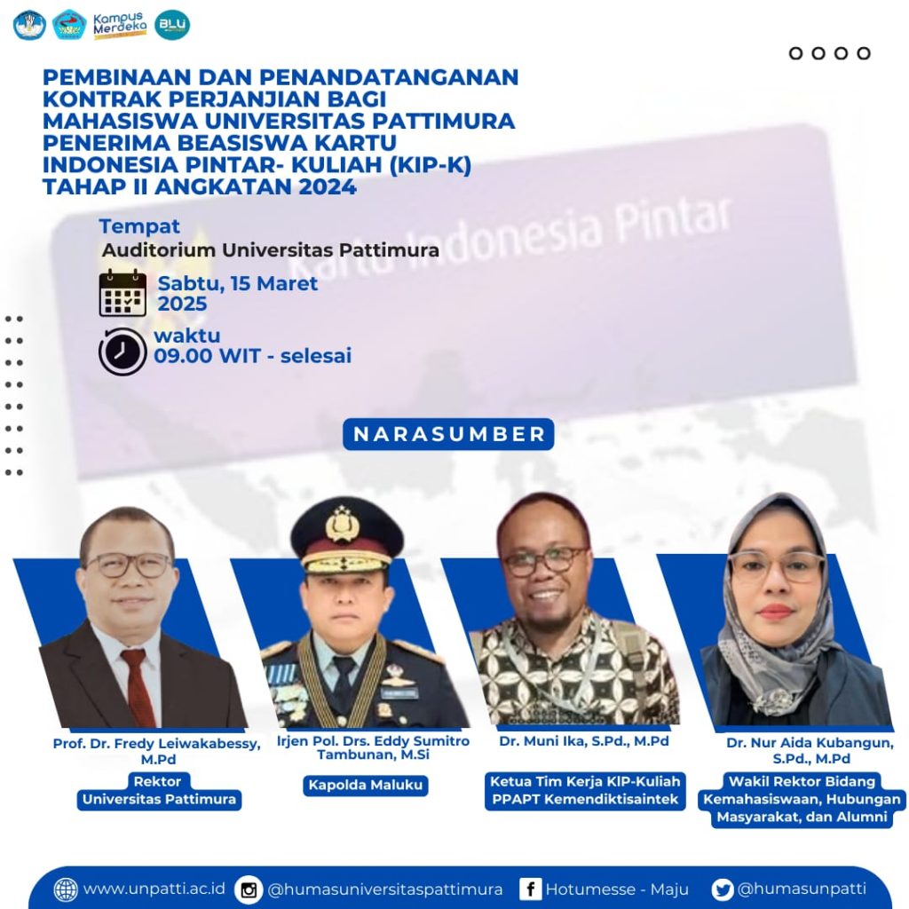 PEMBINAAN DAN PENANDATANGANAN KONTRAK PERJANJIAN BAGI MAHASISWA UNPATTI PENERIMA BEASISWA KIP-K TAHAP II TAHUN 2024 Date: Saturday, 15 March 2025Time: 09:00 - Location: Auditorium Universitas Pattimura Facebook Twitter WhatsApp Pinterest